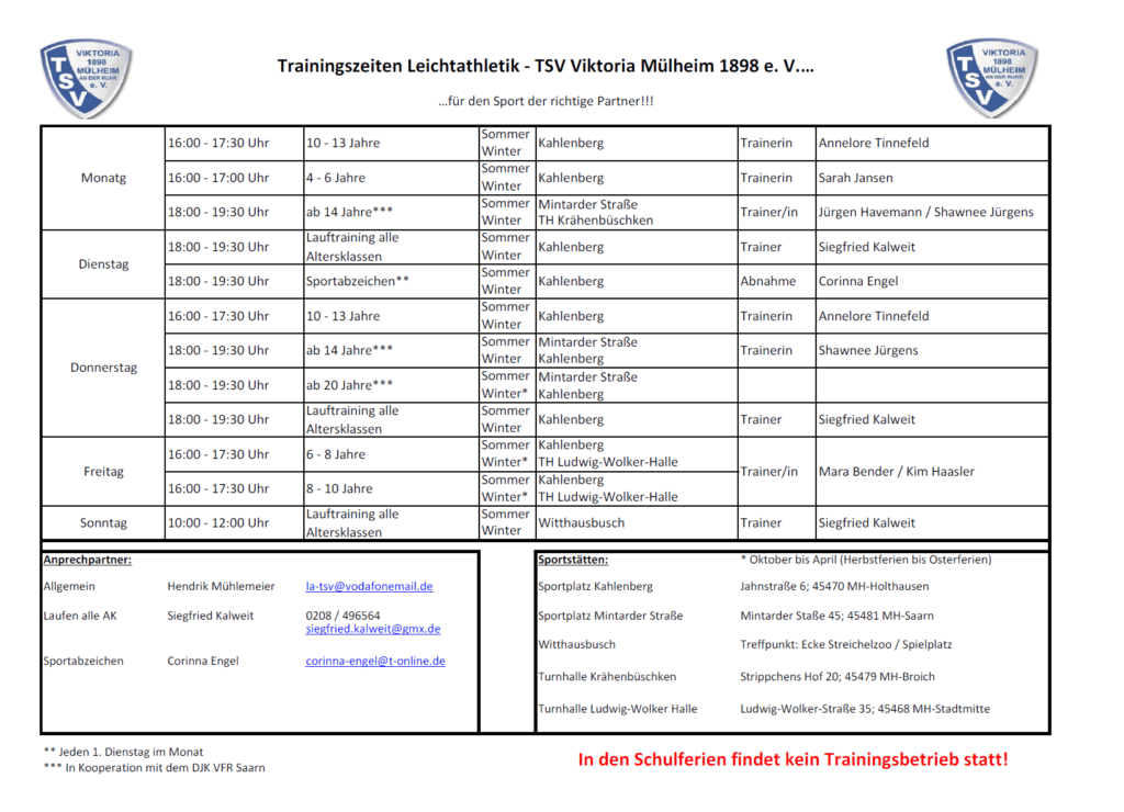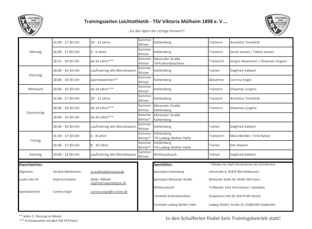 Die Abnahme des Deutschen Sportabzeichens erfolgt an jedem ersten Dienstag im Monat in der Zeit von 17:30 – 19:00 Uhr auf der Sportanlage am Kahlenberg, Jahnstr. 6 in 45470 Mülheim an der Ruhr)